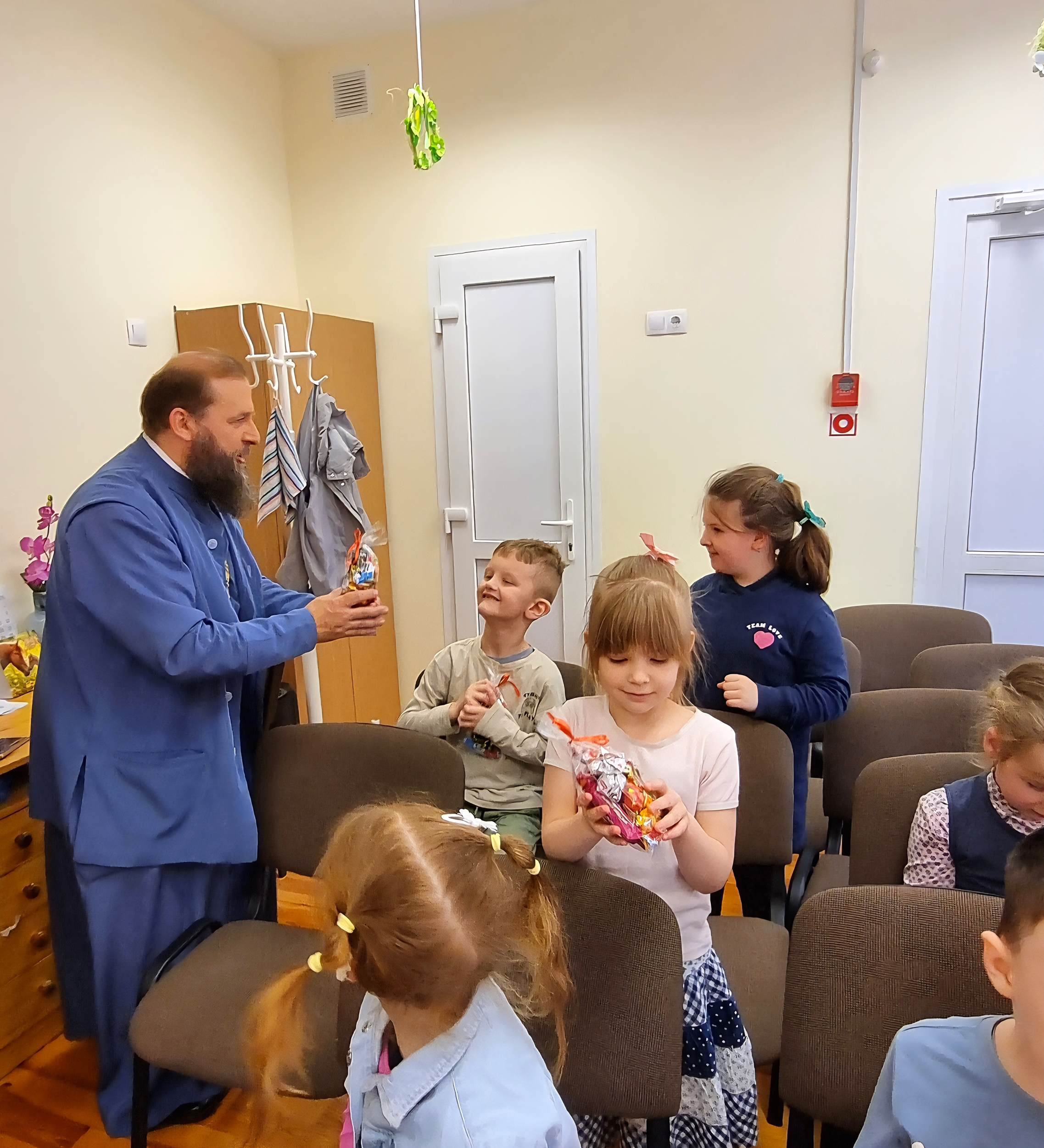 Священнослужитель тепло поздравил воспитателей и ребят с праздником Пасхи Христовой. В своём пастырском слове протоиерей Владимир рассказал детям и взрослым об евангельской истории Воскресения Христова, объяснив, почему этот день называют Торжеством из торжеств и Праздником праздников. Священник подчеркнул, что Пасха дарит каждому надежду на обновление, победу света над тьмой и любви над жизненными трудностями.