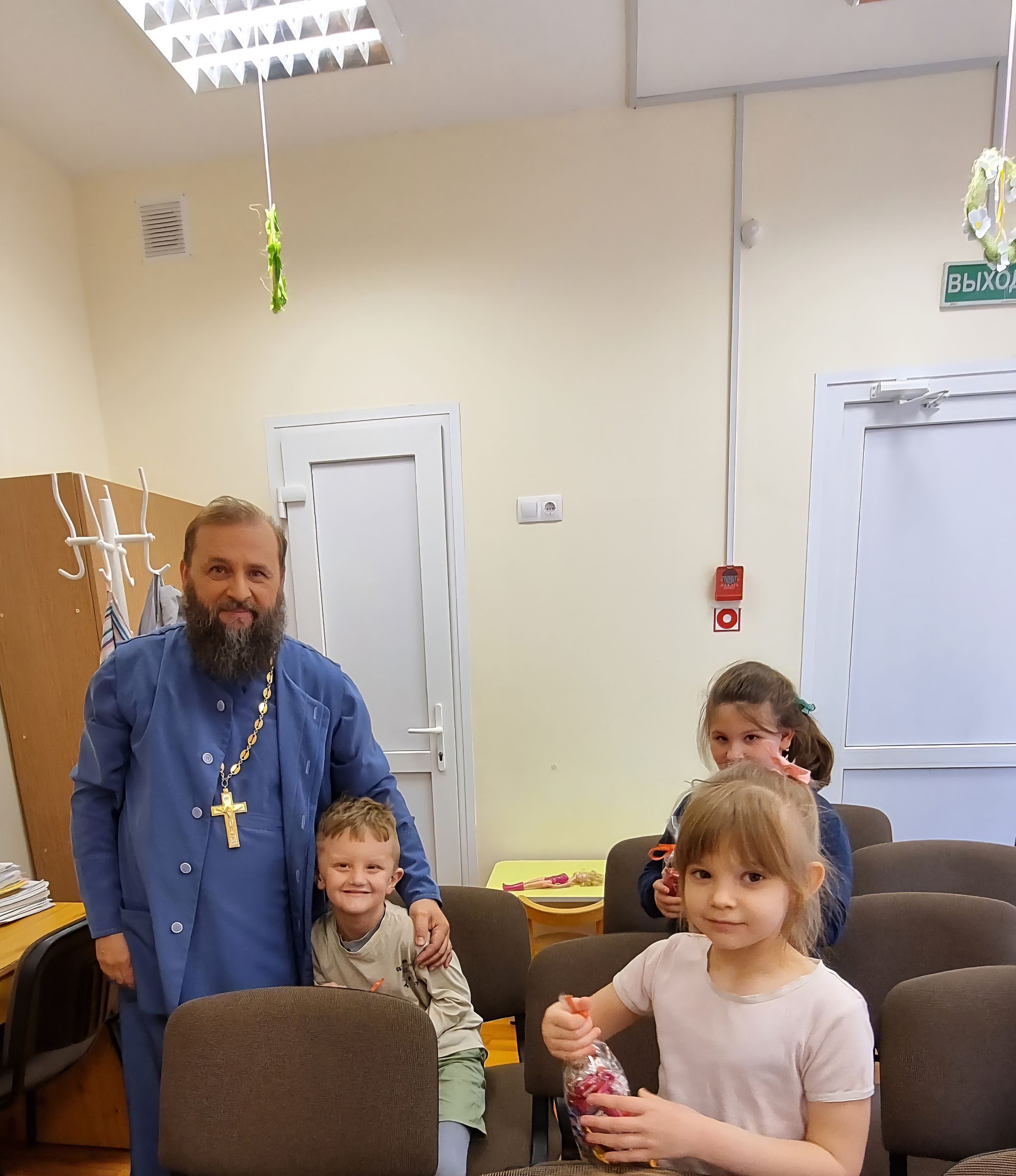 Кульминацией встречи стала передача подарков. Благодаря стараниям прихожан храма, собравших сладкие угощения, игрушки, пособия для развития письма и чтения, детскую литературу, каждый ребёнок получил пасхальный гостинец. Протоиерей Владимир пожелал детям крепости духовных и телесных сил, помощи Божией в учении, а педагогам — терпения, мудрости и благодати.
