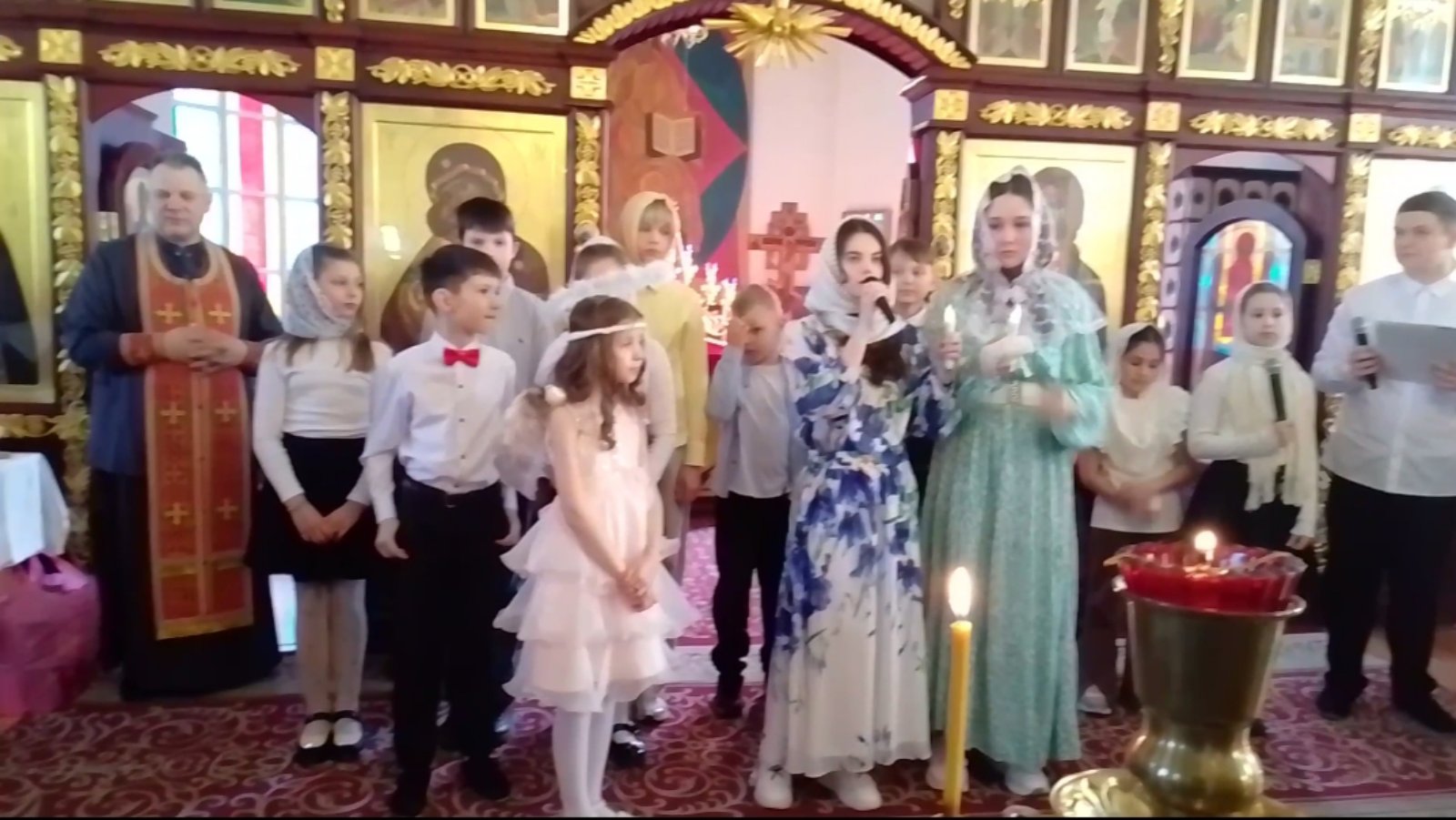 По завершении выступления настоятель храма протоиерей Александр Велисейчик обратился к учащимся и наставникам со словами благодарности и вручил каждому сладкое угощение.
