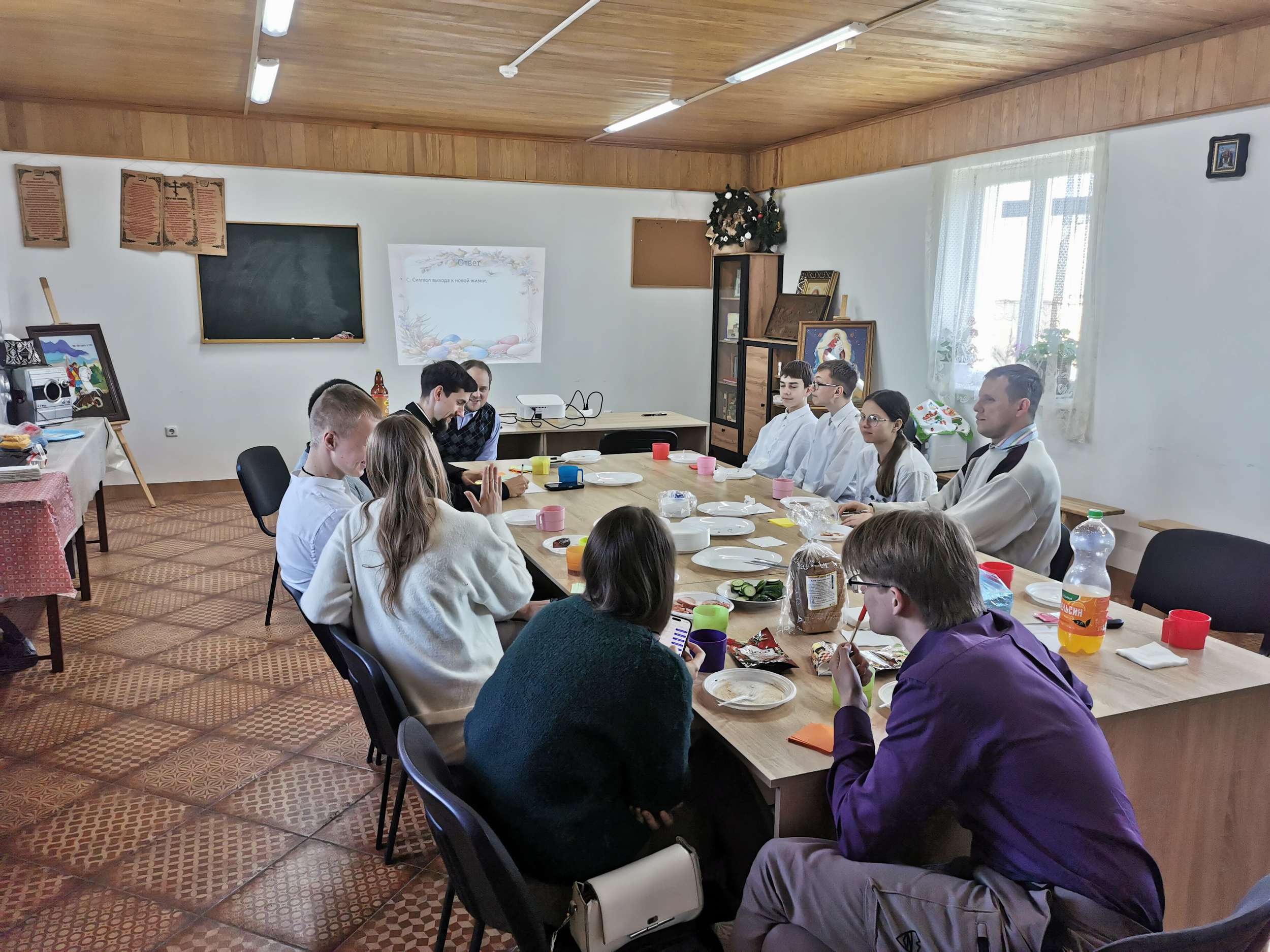 Продолжилось общение в приходском доме за общей трапезой. Для молодых людей была проведена пасхальная викторина, победители которой получили сладкие призы. После этого молодежь общалась, играла в подвижные игры и жарила колбаски на костре. Все участники мероприятия получили памятные подарки.