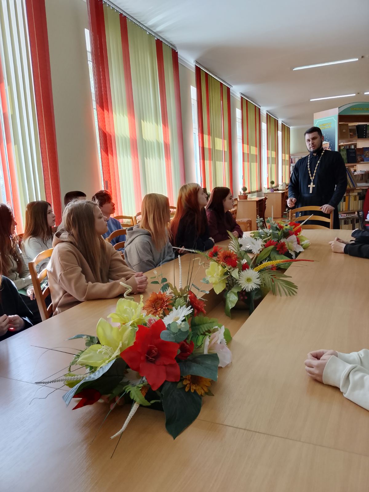 23 апреля клирик прихода храма Собора новомучеников и исповедников земли Белорусской г. Скиделя иерей Александр Дежурко провел беседу с учащимися в библиотеке учреждения образования «Скидельский государственный колледж». Встреча в формате круглого стола была посвящена теме «Доброта спасет мир. Пример святых жен Белорусской земли».