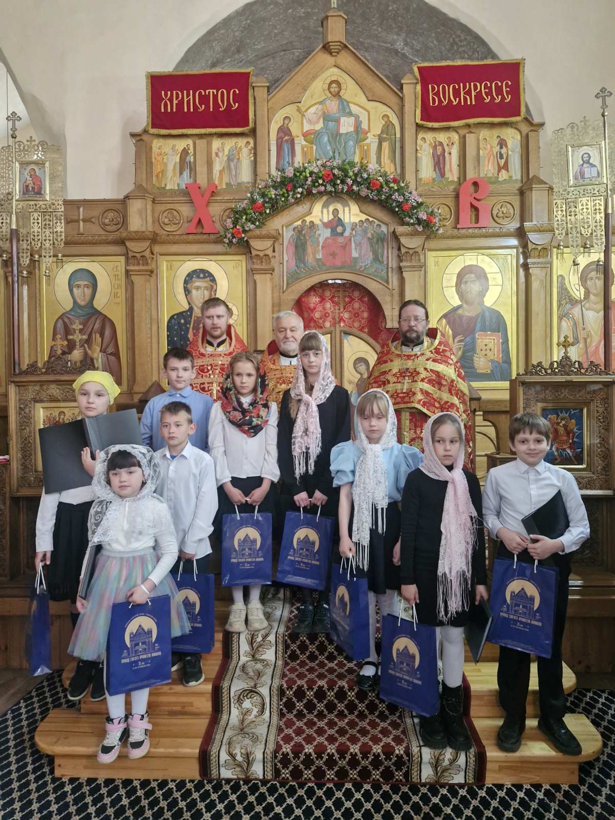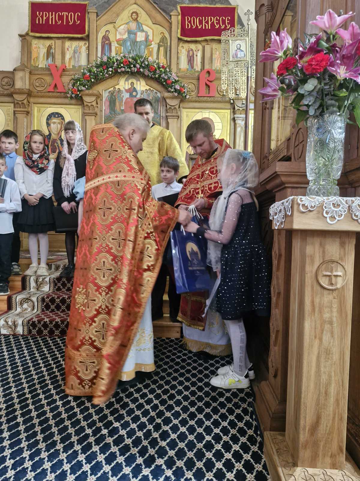 В ответном слове настоятель храма протоиерей Арсений Ананко поблагодарил детей за поздравления и вручил каждому памятные и сладкие пасхальные подарки.