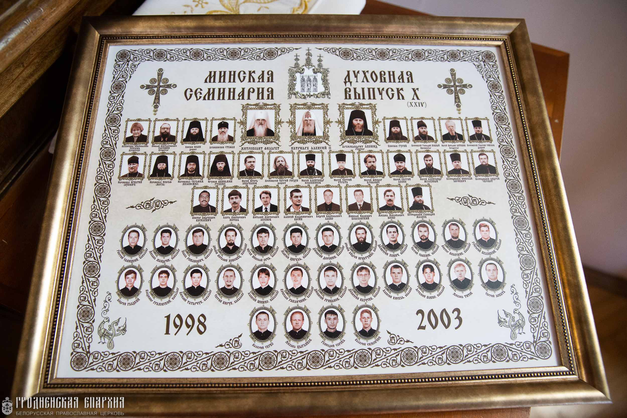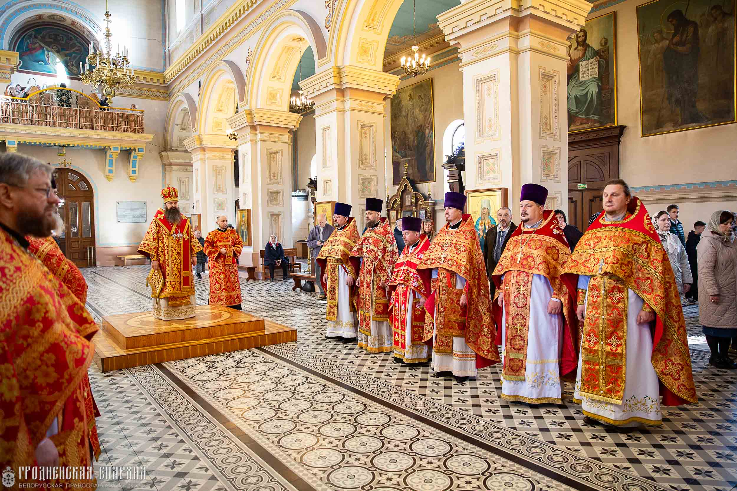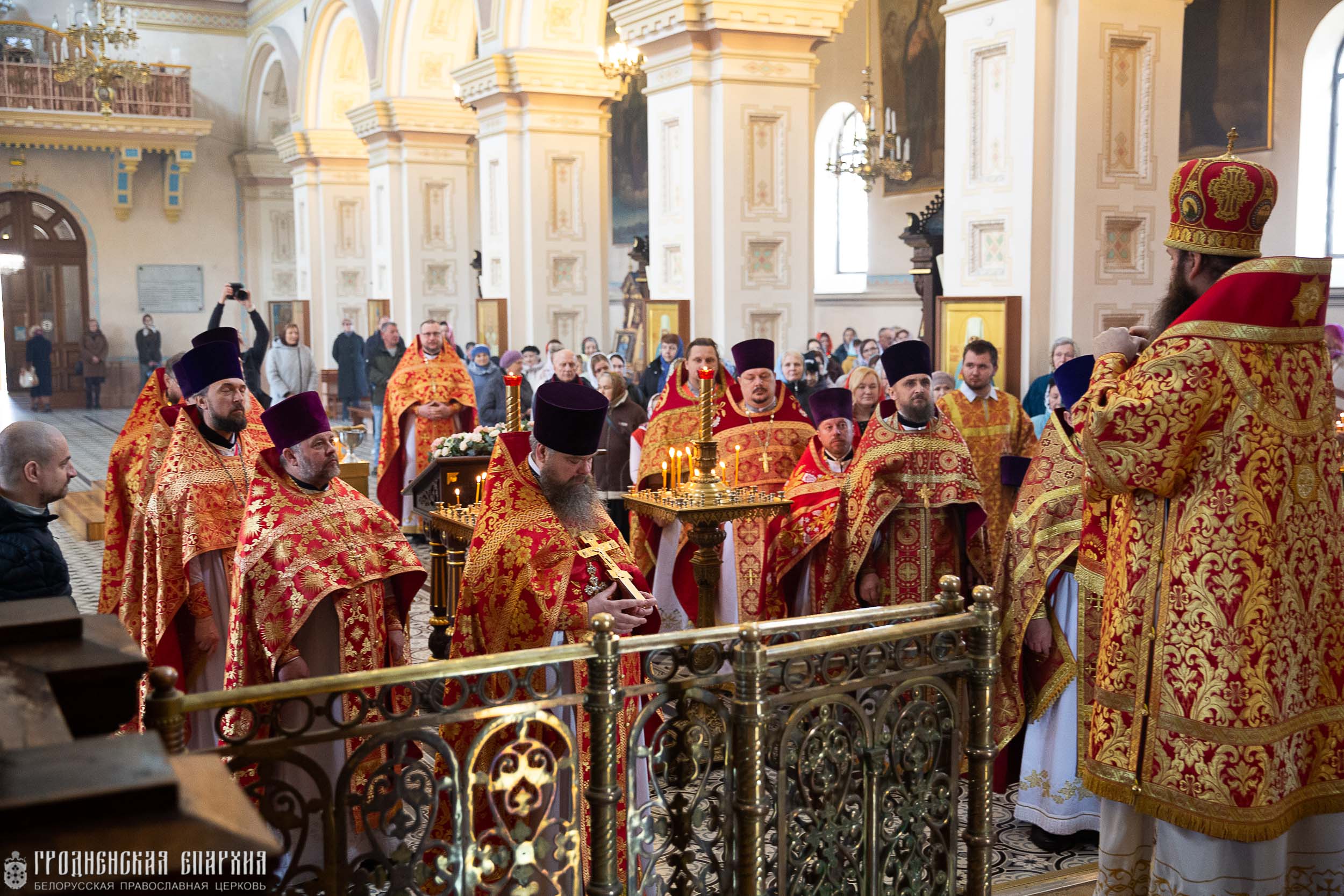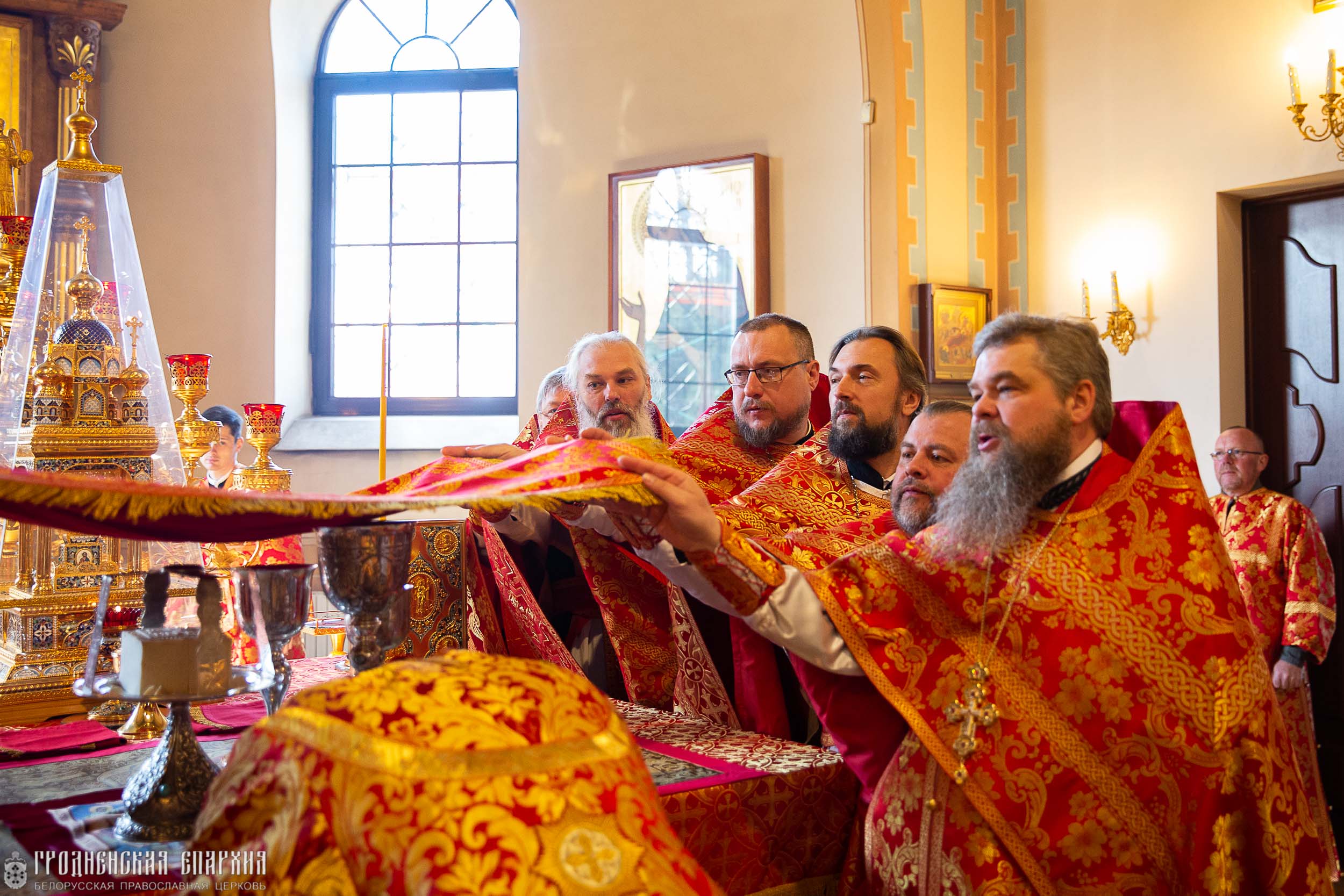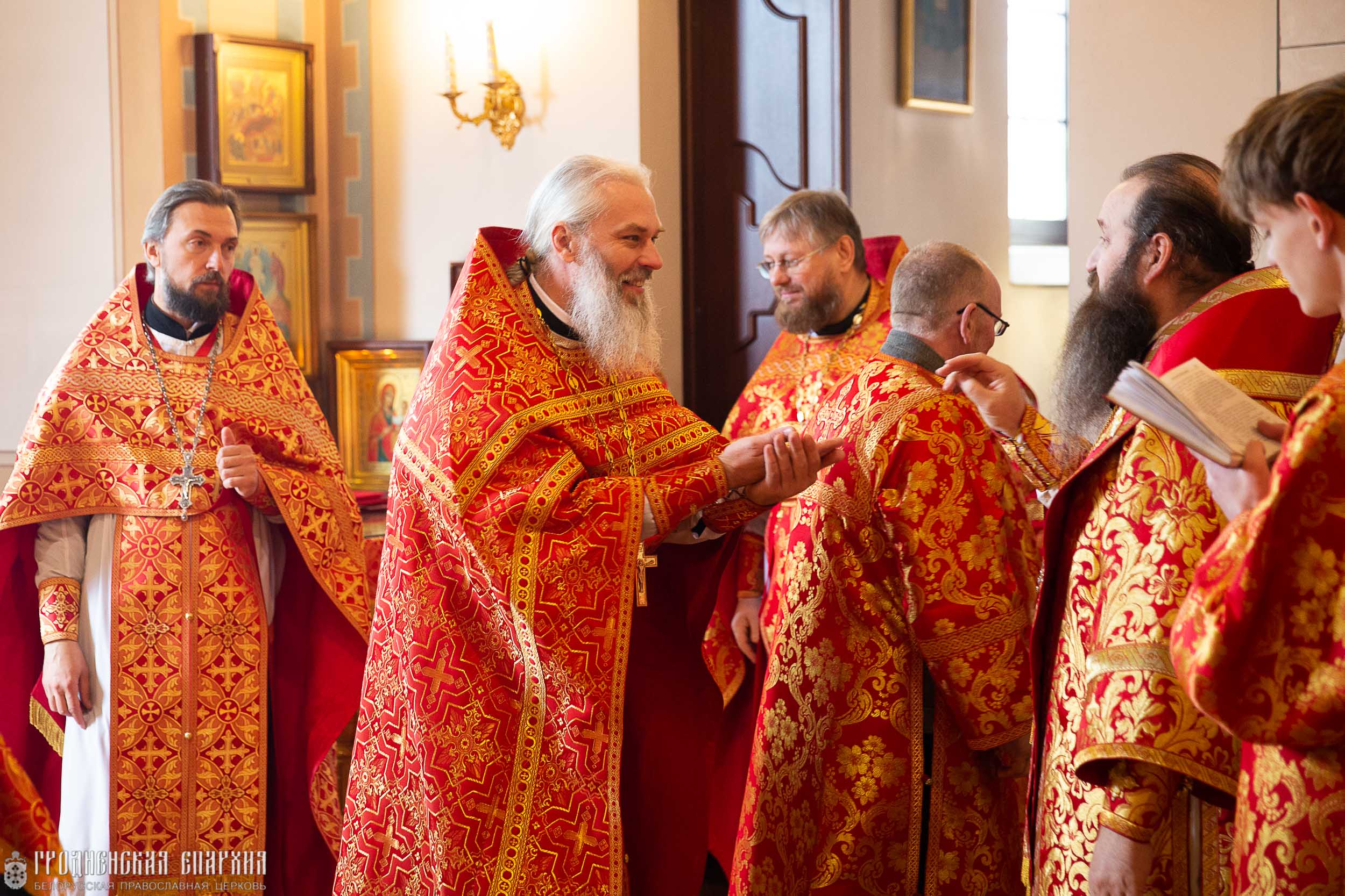 Его Высокопреосвященству сослужили: протоиерей Григорий Беляцкий, настоятель кафедрального собора Покрова Пресвятой Богородицы; протоиерей Вячеслав Гапличник, благочинный Гродненского городского церковного округа; протоиерей Игорь Штепа, настоятель прихода храма святителя Николая Чудотворца аг. Лядно Слуцкой епархии; протоиерей Георгий Савицкий, настоятель прихода храма святых апостолов Петра и Павла г. Островец Лидской епархии; протоиерей Николай Орса, настоятель прихода храма святителя Николая Чудотворца д. Ногородовичи Дятловского района Новогрудской епархии; протоиерей Валерий Серко, старший благочинный церквей Оршанского округа, настоятель храма Рождества Пресвятой Богородицы г. Орша Витебской епархии; протоиерей Павел Сердюк, настоятель прихода храма святителя Николая Японского г. Минска Минской епархии, председатель Синодального отдела по вопросам семьи, защиты материнства и детства Белорусской Православной Церкви; протоиерей Димитрий Казусев, клирик храма святого апостола Андрея Первозванного г. Витебска Витебской епархии; иерей Сергий Бирук-Руссу, настоятель храма Луковской иконы Божией Матери в аг. Луково Малоритского района Брестской епархии; иерей Димитрий Хомич, клирик собора Воскресения Христова г. Брест, настоятель прихода храма Покрова Пресвятой Богородицы д. Прилуки Брестской епархии; Иерей Алексий Шишко, настоятель храма святителя Николая Чудотворца аг. Могильно Молодечненской епархии, преподаватель Минского духовного училища.
