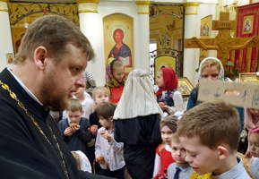 Напрыканцы святочнай сустрэчы айцец Аляксандр разам з матушкай Аленай яшчэ раз павіншавалі дзяцей і дарослых з Вялікаднем, пачаставаўшы пасхальнымі прысмакамі.