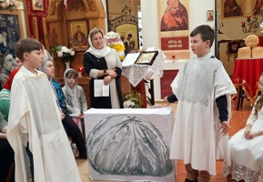 Маленькія артысты спрабавалі аднавіць падзеі, якія адбыліся ля пячоры, дзе быў пахаваны Іісус Хрыстос, спявалі велікодныя песні, віншавалі ўсіх прысутных з Пасхай.